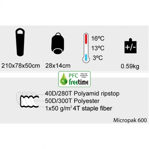 Modèle 1 à 2 saisons à la température de confort de 16°C, le Micropak 600 de Freetime est un sac de couchage de type sarcophage à ranger dans un sac de compression de 24cm x Ø14cm.