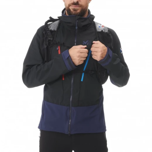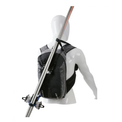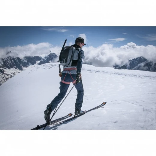 Adapté aux parois verticales grâce à ses porte-piolets et à son porte-skis diagonal amovible, ce sac utilise un harnais de portage qui le maintient près du corps, réglable instantanément à l’aide d’un système d’ajustement rapide par câble. Sur les bretelles sont placées deux poches en mesh pour glisser des flasques de 500 ml, ainsi que deux autres poches zippées.
