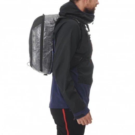 Il combine une matière Dyneema® tissée à un empiècement en Dyneema® stretch très résistant sur l’avant, dont le haut pouvoir d’extension permet d’optimiser le remplissage du sac, tout en maintenant la charge stable.