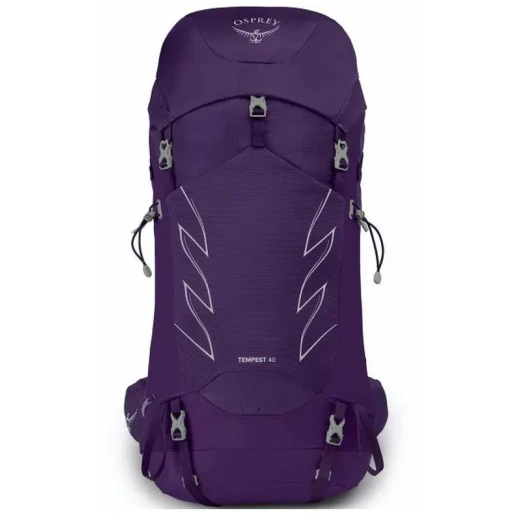 Le Tempest 40 est composé de plusieurs espaces de rangement dont un compartiment pouvant accueillir un sac de couchage, deux poches de ceinture zippées, une poche zippée sous rabat, une sangle de Sternum avec sifflet, une sangle de compression sur les côtés, de bandes réfléchissantes et une fixation pour lampe LED.