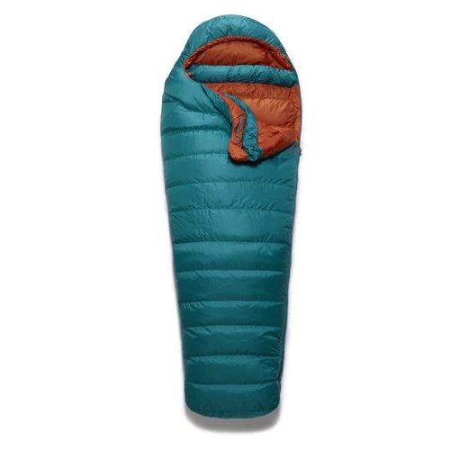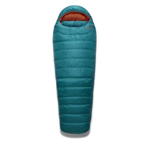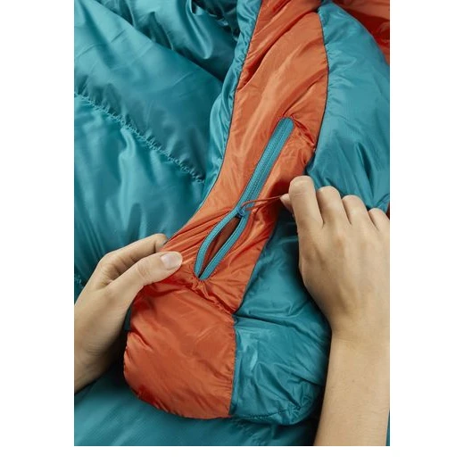 Sufisamment chaud pour vos bivouacs printaniers, il est garni de 500 grammes de duvet de canard au pouvoir gonflant de 650 cuin. Entièrement composé de tissus recyclés, il possède une matière extérieure en Pertex® Quantum recyclé légère et résistante, et une doublure en nylon recyclé. Très astucieux, son cloisonnement en trapèze permet au duvet de gonfler de manière optimale afin d’éliminer les zones froides et d’augmenter l’apport de chaleur. Sa forme sarcophage ample et son compartiment pour les pieds élargi offrent quant à eux un maximum d’espace et de confort, sans pour autant créer de pertes de chaleur. En effet, ce sac de couchage Rab est également doté d’une collerette qui retient la chaleur quand la température chute et d’une fermeture éclair ¾ avec un rabat en duvet qui empêche les courants d’air.